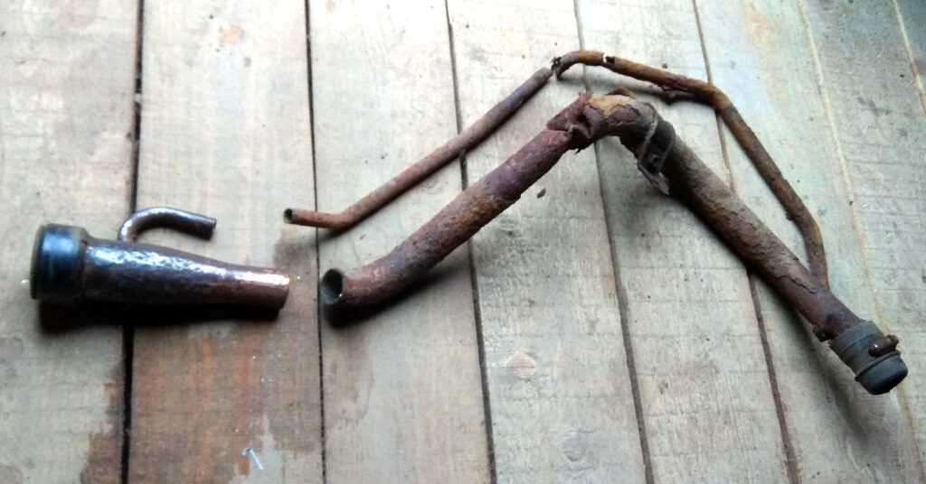 Сняв заднее левое колесо и подкрыльник с машины получил доступ к заливной трубе. Со снятием трубы пришлось немного повозиться, так как многие болты плохо откручивались из-за ржавчины. В итоге достал горловину, на фото видно в каком она состоянии.