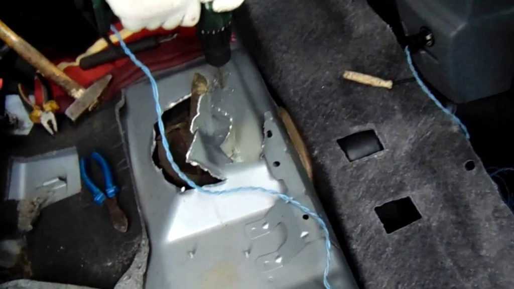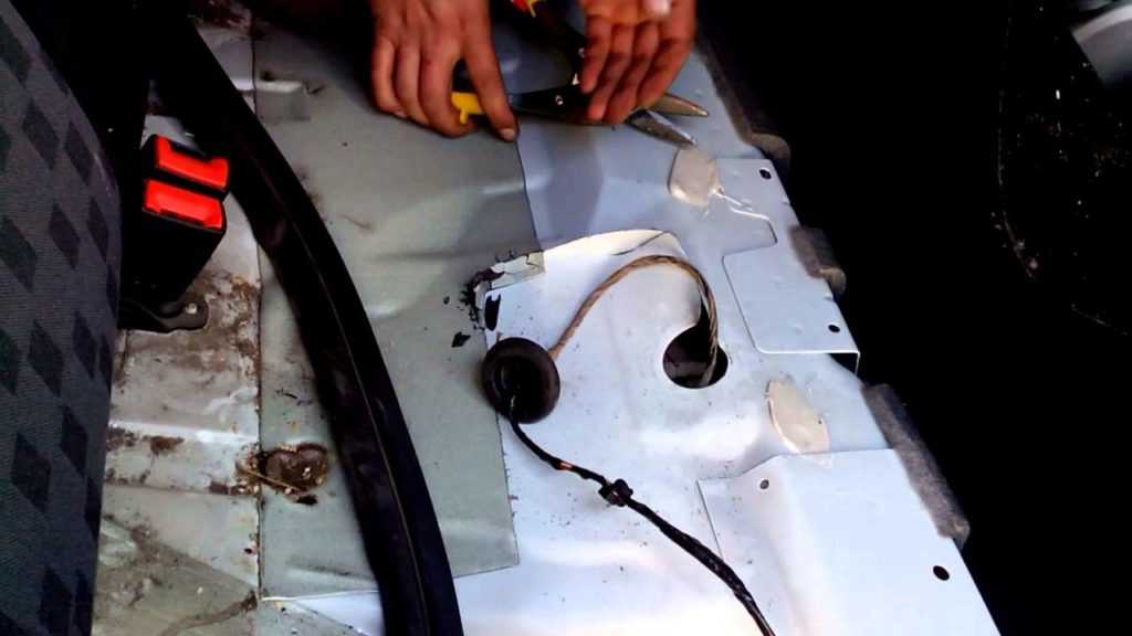 - После того как была открыта заглушка под задним сиденьем «Форд Мондео», потребуется взять ножницы по металлу и приступить к расширению отверстия для того, чтобы бензонасос мог пролезть в него.