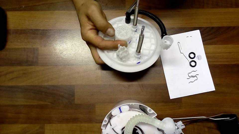 Сняв нижнюю крышку с модуля, можно увидеть непосредственно фильтр – в его центр установлен бензонасос, на нем же смонтированы остальные элементы. Для удобства стоит положить рядом старую и новую деталь, последовательно и аккуратно переставляя все элементы со старого фильтра на новый.