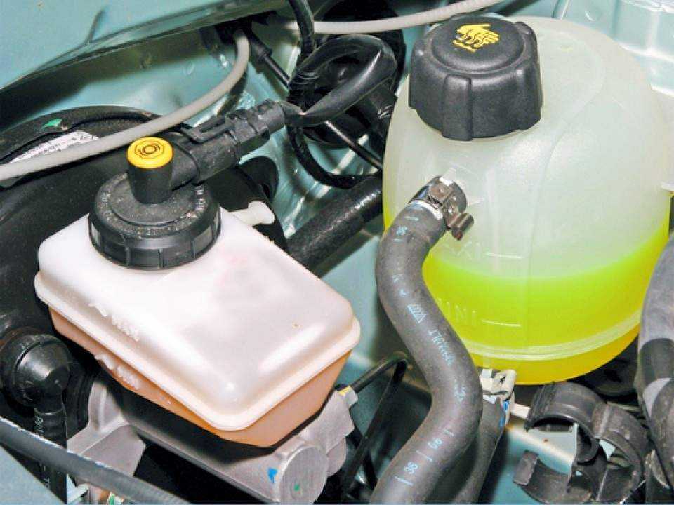 Аналогичным образом «продуваются» механизмы остальных трех контуров в описанной очередности. В процессе выполнения работ обязательно следить за уровнем состава и периодически доливать свежую эмульсию. Операция считается оконченной, когда из всех штуцеров льется свежая «жижа». Завершающий этап в технологии замены – восстановление уровня рабочего тела в бачке.