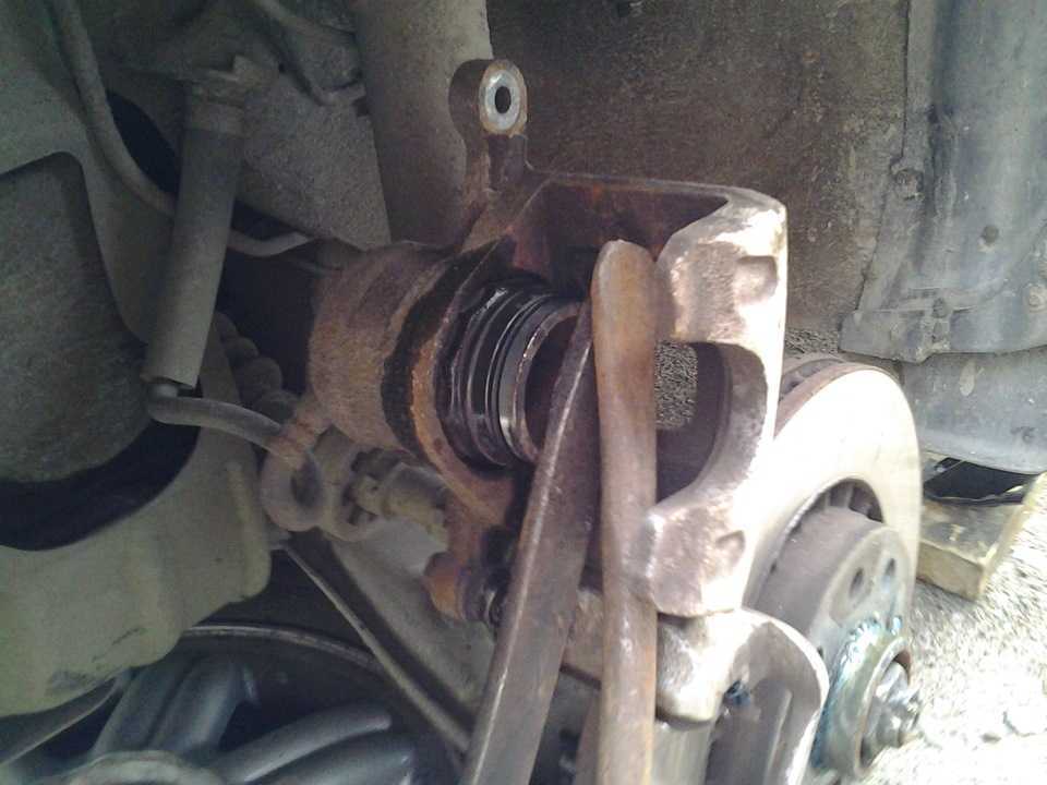 Включаем ручной тормоз как можно сильнее. Расслабляем болты (перед поднятием авто), достаточно их просто “сорвать”. Поднимаем машину и откручиваем болты