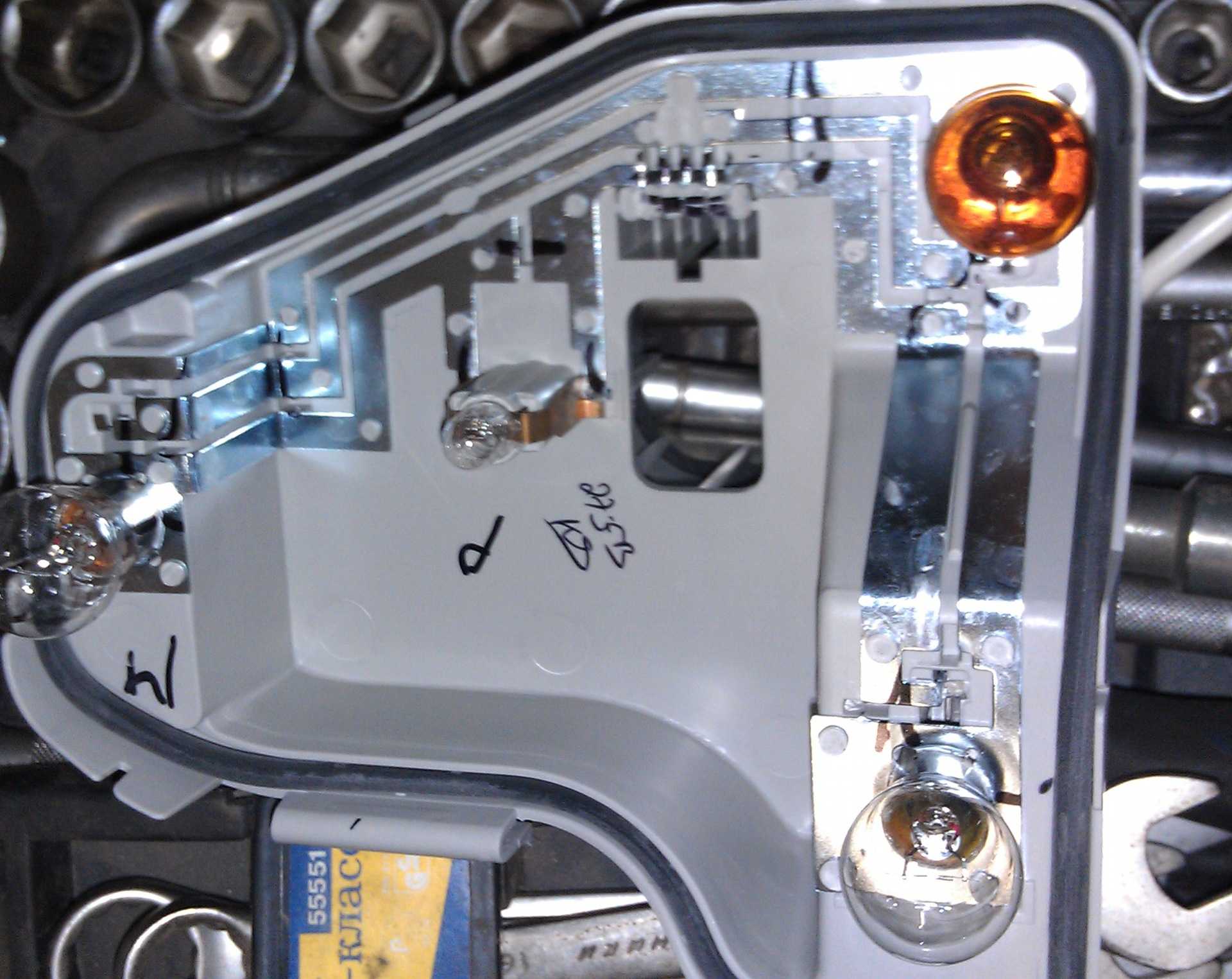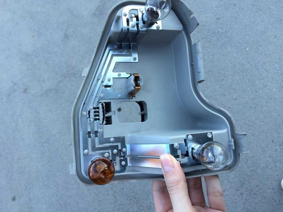 Менять лампы можно так же, как и в основном блоке: снять язычки и вытащить скобу с лампами из лампы.