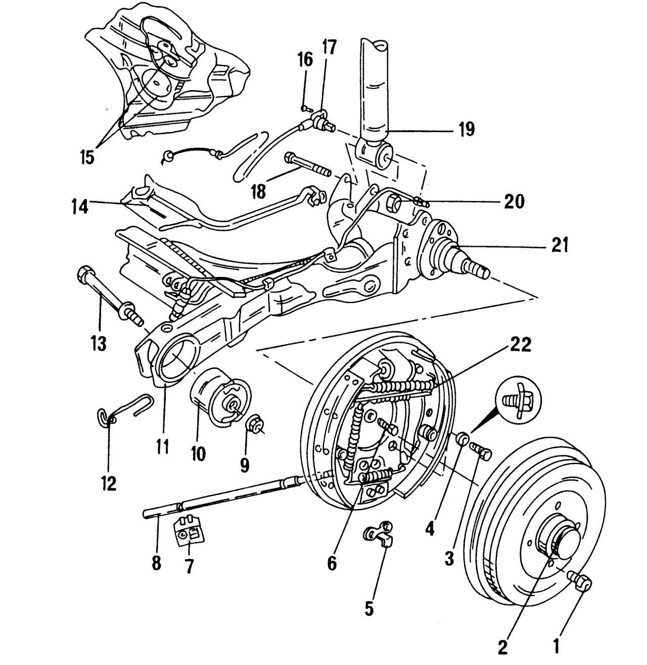 Рис. 278. Детали задней подвески: 1 — болт крепления колеса, 110 Н·м; 2 — тормозной барабан с подшипником колеса; 3 — болт, 60 Н·м, используется с упругой шайбой (4); 4 — упругая шайба; 5 — направляющая троса стояночного тормоза; 6 — болт, 60 Н·м, используется без упругой шайбы (4); 7 — держатель троса стояночного тормоза; 8 — трос стояночного тормоза; 9 — гайка, 65 Н·м; 10 — резиновая опора продольных рычагов подвески; 11 — балка моста; 12 — держатель троса стояночного тормоза; 13 — болт (вставлять изнутри наружу); 14 — проводка (система ABS); 15 — кронштейн подшипника балки моста; 16 — болт, 10 Н·м; 17 — датчик частоты вращения колеса; 18 — болт; 19 — амортизатор; 20 — гайка, 55 Н·м; 21 — цапфа ступицы; 22 — щит тормозного механизма с тормозными колодками |
