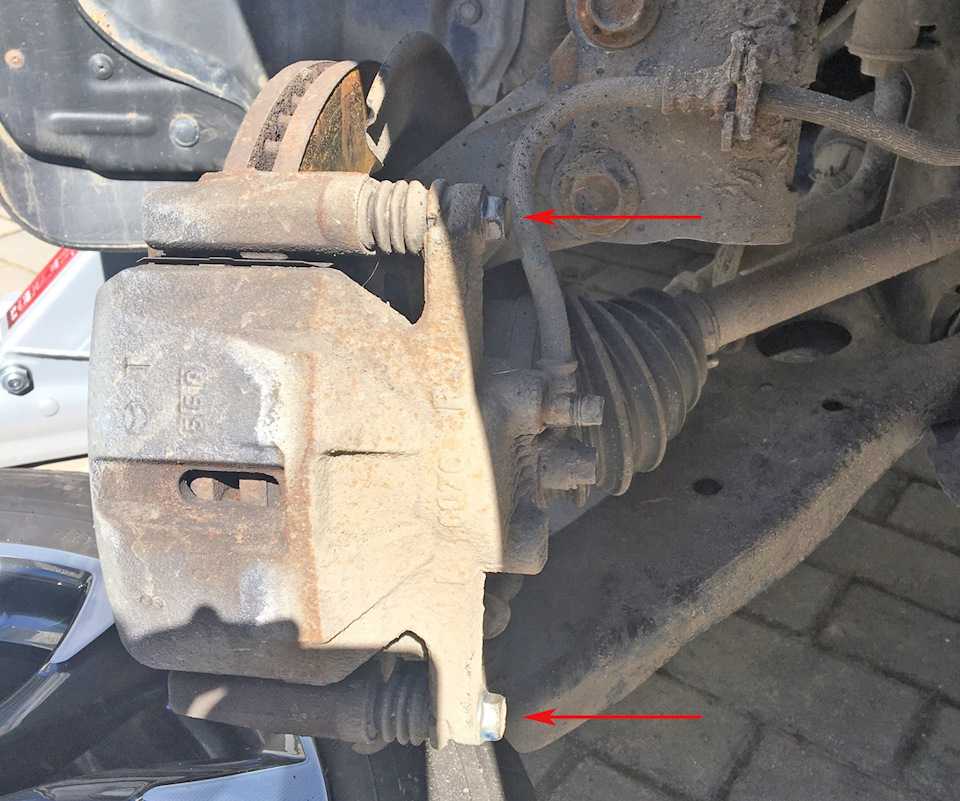 Суппорт удерживается двумя направляющими болтами. Нижний болт ослабить головкой на 14мм. Верхний болт головкой не отвернуть, поэтому ослабляем его с помощью рожкового ключа на 14 мм. Выкручиваем болты и убираем в сторону.