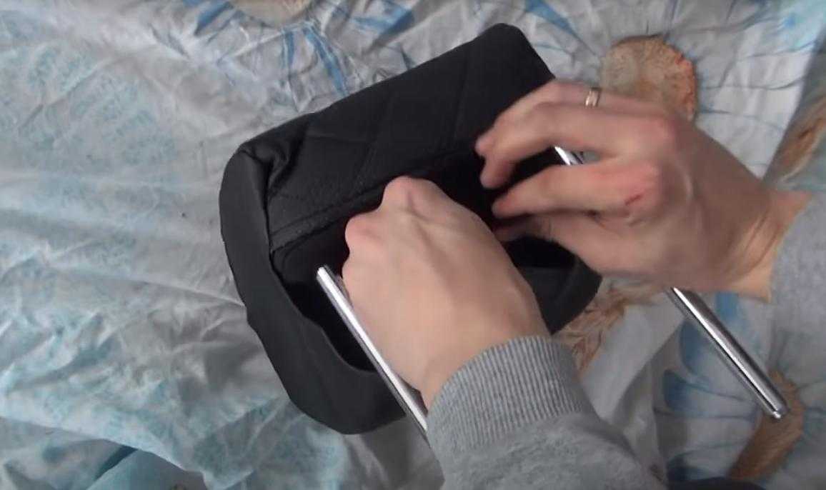 Чтобы приступить к чехлам для спинки заднего сидения. В начале нужно снять три подголовника, на них можно одеть заранее подготовленные чехлы. Самый маленький чехол для среднего подголовника, учтите это располагая их.