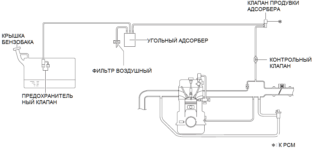 Ошибка DTC P0443 связана с неисправностью системы улавливания паров топлива Evaporative Emission Control System (EVAP) • Система улавливания паров топлива (EVAP) снижает выбросы углеводородов в атмосферу из топливного бака • При заглушенном двигателе пары бензина поступают в корпус адсорбера, где поглощаются слоем угольного адсорбента. При работающем двигателе в соответствии с условиями его работы пары бензина, поглощенные угольным адсорбером, проходят через электромагнитный клапан продувки вместе с воздухом, поступающим через воздушный фильтр адсорбера, и подаются во впускной коллектор двигателя, сгорая затем в камере сгорания.