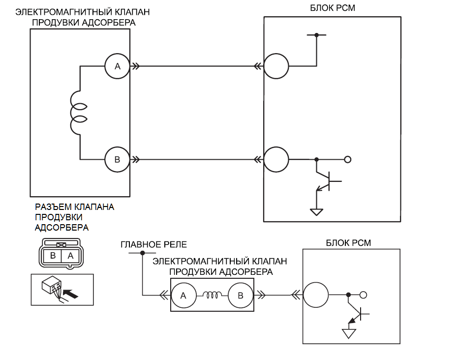 Возможные причины:• Неисправность электромагнитного клапана продувки адсорбера • Неисправность разъёма или плохой контакт • Обрыв в проводе между контактом А клапана продувки и контактом блока PCM • Обрыв в проводе между контактом А и главным реле • Короткое замыкание на «массу» в проводе между контактом А клапана продувки и контактом блока PCM • Обрыв в проводе между контактом В клапана продувки и контактом блока PCM • Короткое замыкание на цепь питания в проводе между контактом В клапана продувки и контактом блока PCM • Короткое замыкание на «массу» в проводе между контактом В клапана продувки и контактом блока PCM• Неисправность блока РСМ