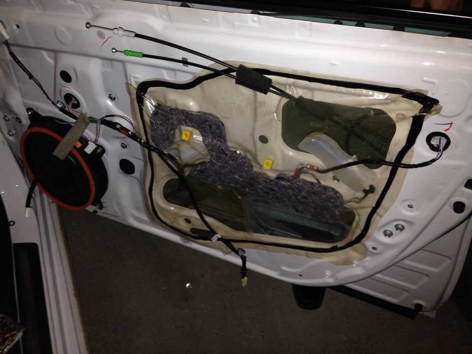 Снята защитная плёнка, осталось убрать динамики. Провода останутся, они не помешают мастерам аккуратно проклеить шумоизоляционные материалы внутрь двери.