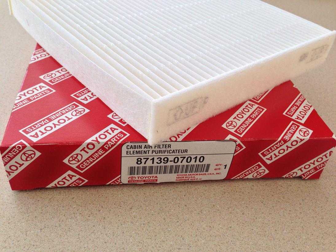 С завода устанавливался оригинальный салонный фильтр Toyota 87139-07010. Стоимость его составляет от 1700 руб. Это обычный бумажный фильтр, однако можно выбрать еще угольный. Артикул угольного фильтра Toyota 8713950060 — стоимость фильтра так же от 1800 рублей. Помимо оригинальных фильтров для замены можно подобрать аналог вполне хорошего качества по более доступной цене.