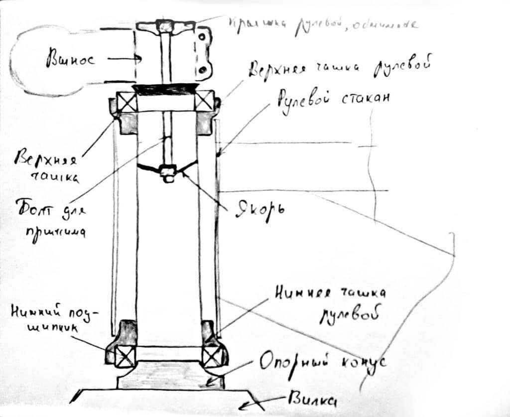 Конструкция такой рулевой до удивления простая. Фиксация узла, вместо гайки, осуществляется выносом руля. Сам вынос руля прижимается якорем рулевой. Якорь вбивается непосредственно в шток вилки и держится там только благодаря своим упругим свойствам. Шток не имеет резьбы и одновременно используется как основание для выноса руля. Что, к слову, принципиально отличает её от резьбовой версии, где вынос руля вместе с дополнительной трубой вставляется внутрь штока.