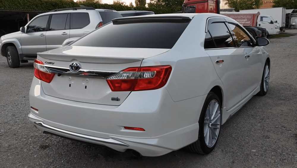 Задняя часть автомобиля Camry имеет стильную крышку багажного отделения и светодиодные фонари. Бампер имеет ходовые огни, а под ним виднеются две выхлопные трубы.