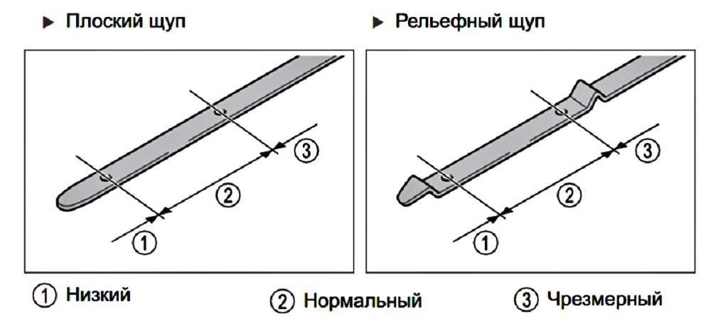 После пятиминутного ожидания необходимой для того, чтобы прогретая смазка максимально стекла в картер необходимо извлечь щуп контроля уровня и с помощью ветоши вытереть его начисто. Далее следует снова вставить щуп на свое место до упора и снова извлечь его для того, чтобы проверить актуальное состояние уровня смазки (см. на рисунке):
