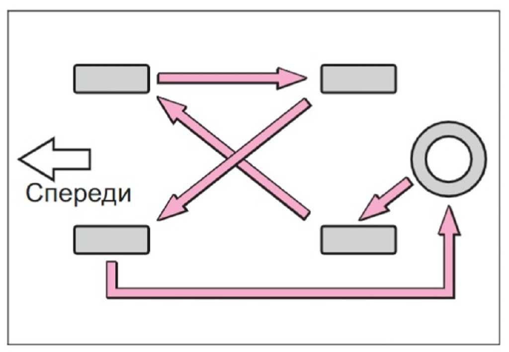 Для того, чтобы продлить сроки использования шин и для предупреждения неравномерного износа шины рекомендуется переставлять через каждые 10 тыс. на одометре в таком порядке, как показано на схеме: