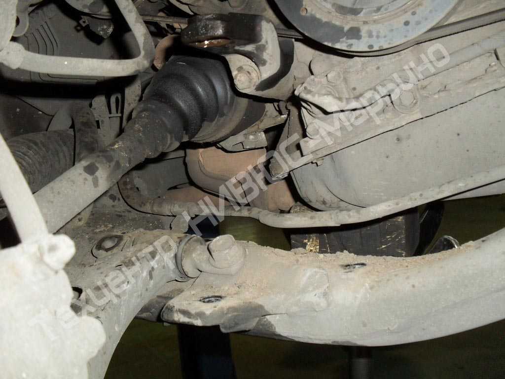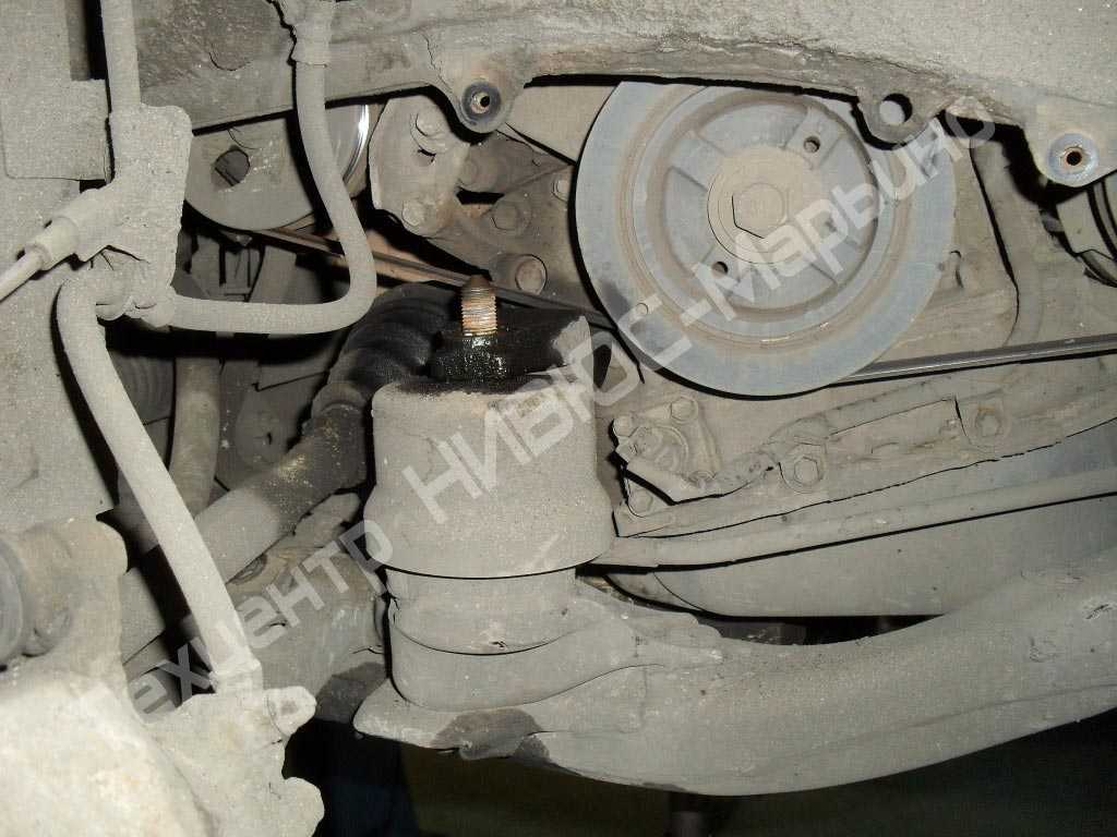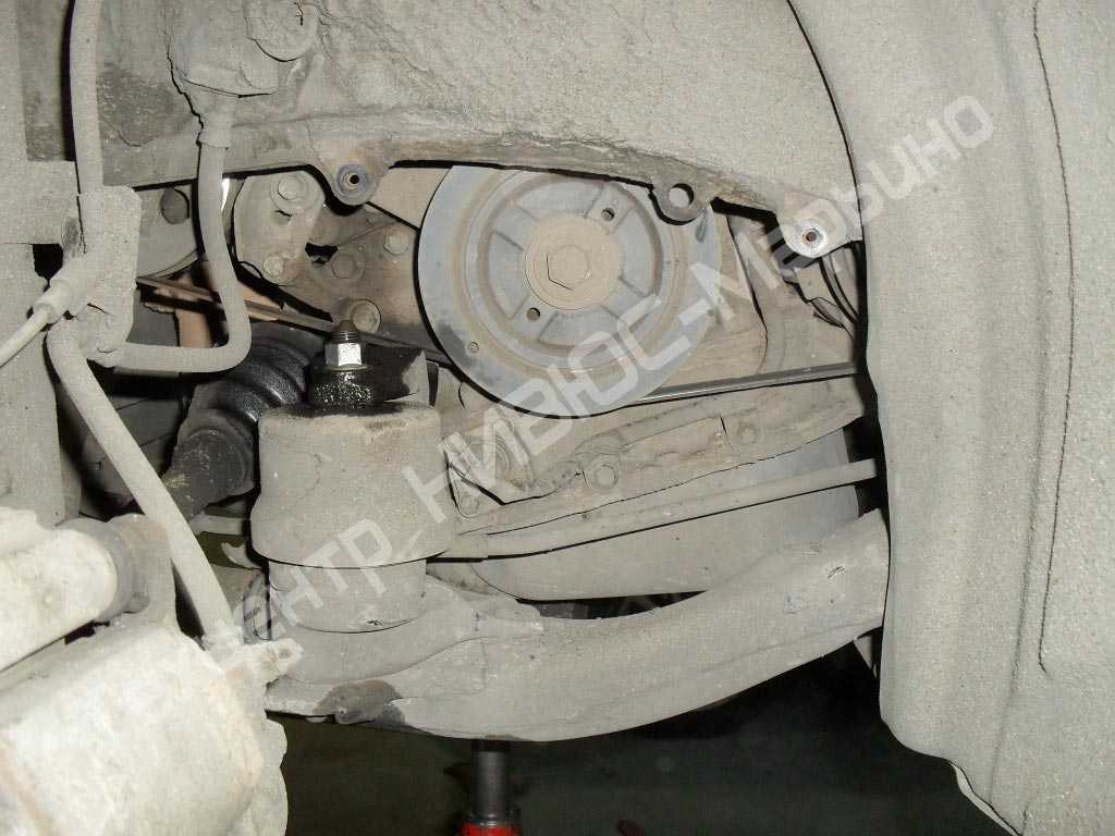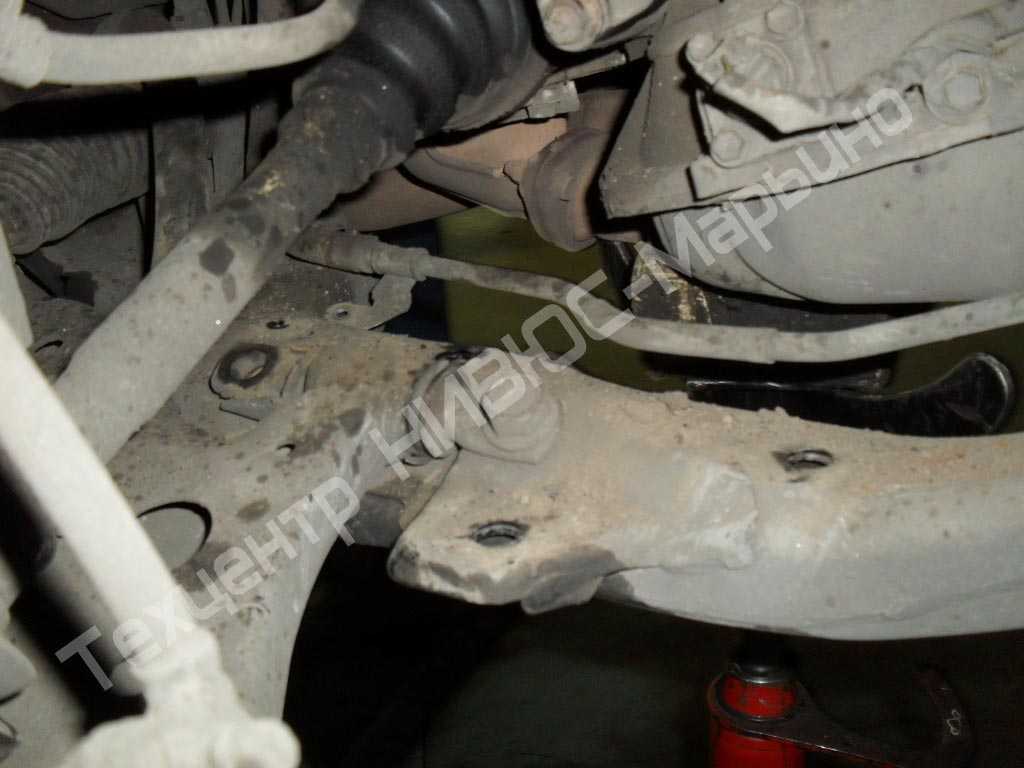 Закрепляем крепления сайлентблоков переднего и заднего, затягиваем крепления шаровой опоры и устанавливаем подушку крепления двигателя. После замены сайлентблоков в обязательном порядке нужно регулировать сход — развал.
