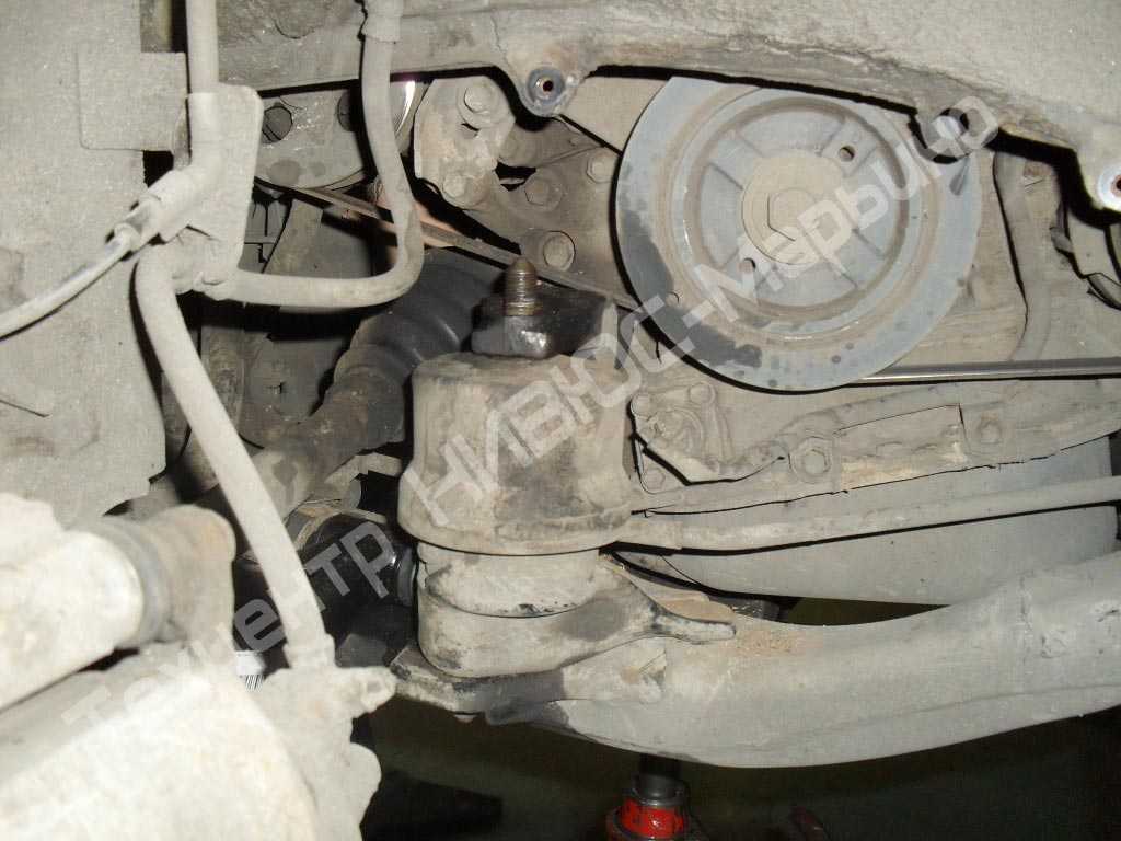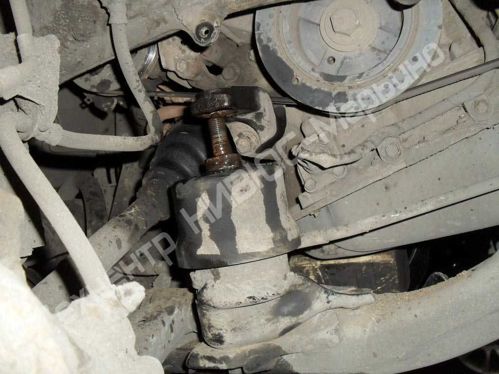 Для снятия рычага нам нужно открутить болт и две гайки крепления рычага к шаровой опоре. Доступ к переднему сайлентблоку закрывает подушка двигателя. Для того, чтобы ее снять нам нужно подпереть двигатель и снять подушку.