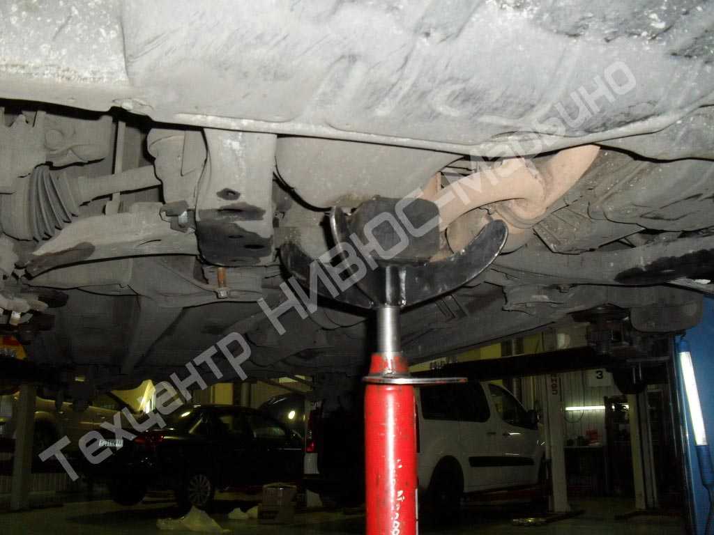 9. Поднятие ДВС. Используя специальную гидравлическую стойку с проставкой, чтобы не повредить поддон ДВС, приподнимается мотор.