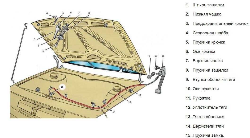 Приведем картинку, которая доступно объясняет работу механизма открытия/закрытия крышки капота на примере «восьмерки».
