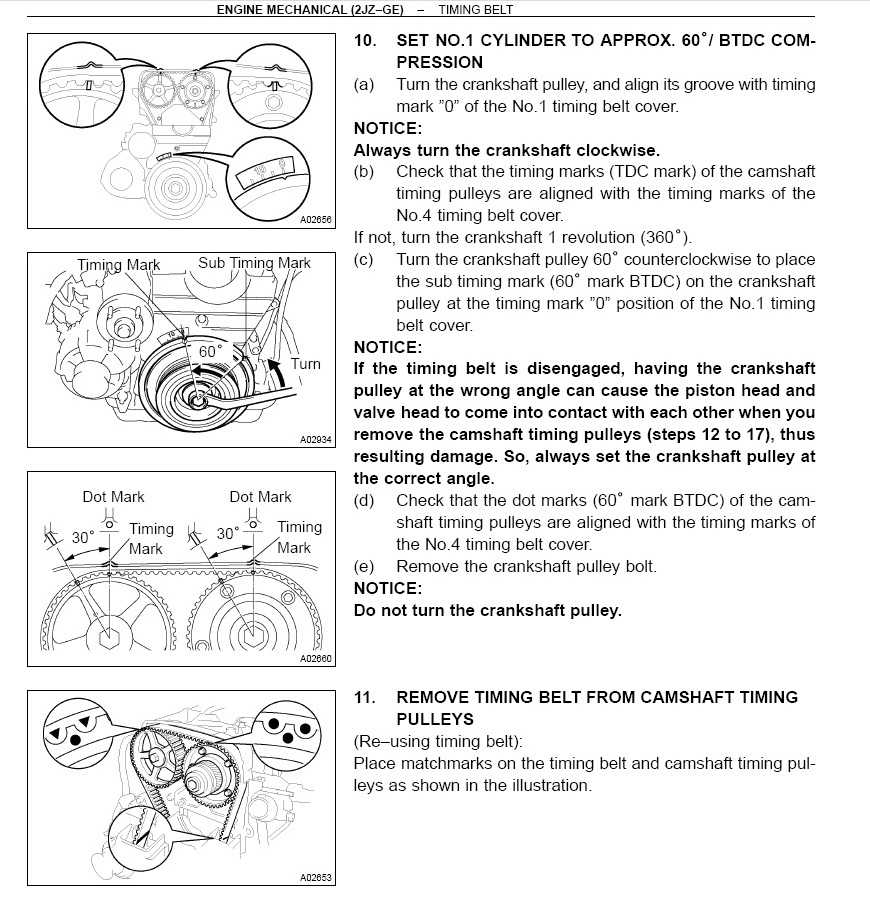 Смена ремня на моторах 1JZ-GE 2JZ-GE  осуществляется совместно с сальниками роликами и гидравлическим натяжителем. На верхней крышке имеется фото правильного съёма муфты VVT-I . Четко очерченные установочные метки на ремне и на шестернях практически не оставляют шанса неверной установки ремня. При обрыве ремня ГРМ не происходит фатальной встречи клапанов с поршнем. Ниже на фотографиях примеры износа ремня, номер ремня ГРМ, снятые шестерни, установочные метки и гидравлический натяжитель.